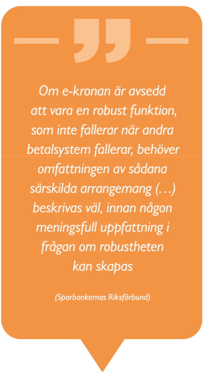 En annan fråga som lyfts av många remissinstanser är betalningssystemets robusthet vid kris och krig. Flera konstaterar att ökad robusthet kräver någon form av parallellitet till det befintliga betalningssystemet. Sparbankernas Riksförbund efterfrågar en beskrivning av vilka särskilda arrangemang som skulle göra att en e‑krona inte skulle fallera när andra betalsystem fallerar.