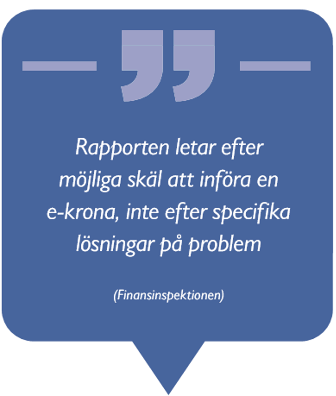 Vad är det då remissinstanserna har reagerat på? Den tydligast uttalade kritiken mot upplägget av Riksbankens utredning om e‑kronor kom från Finansinspektionen. Myndigheten menar att analysen borde ha utgått från att förutsättningslöst undersöka hur de eventuella problem som uppstår om kontanter fortsätter att minska i betydelse ska lösas, istället för att fokusera enbart på e-kronan som möjlig lösning. Många andra remissinstanser efterfrågar en bredare ansats så att alternativ till e‑kronor beaktas , däribland Bankföreningen.
