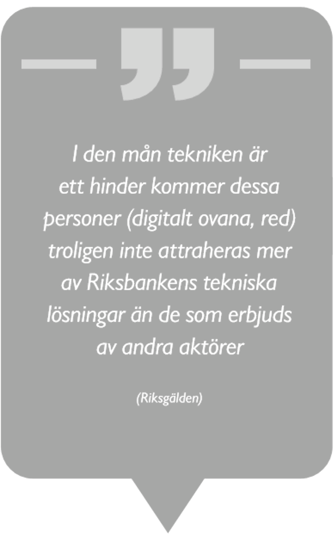 Andra remissinstanser menar dock att ambitionen visserligen är lovvärd, men är frågande till om e‑kronor verkligen skulle kunna uppnå målet. Riksgälden skriver att ”I den mån tekniken är ett hinder kommer dessa personer troligen inte attraheras mer av Riksbankens tekniska lösningar än de som erbjuds av andra aktörer.” och Sparbankernas Riksförbund skriver att man ”…har svårt att se på vilket sätt som en e-krona skulle erbjuda möjlighet till förändring för aktuella grupper. Förbundet antar t.o.m. att ett nytt betalsystem för vissa skulle kunna framstå som ytterligare en digital komplikation.”
