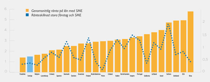En studie från OECD år 2019 visar att räntorna till små och medelstora företag i Sverige tillhör de lägsta i hela OECD. Även ränteskillnaden mellan små och stora företag är utmärkande låg (figur 1). Bankföreningen har gått igenom de kvantitativa undersökningar som genomförts under senare år för att kartlägga utvecklingen av företags tillgång till banklån och andra vanliga kreditformer. Överlag framträder en positiv bild där allt färre företag anser att det är avsevärt svårare än normalt att få tillgång till kapital sedan finans- och eurokrisen.