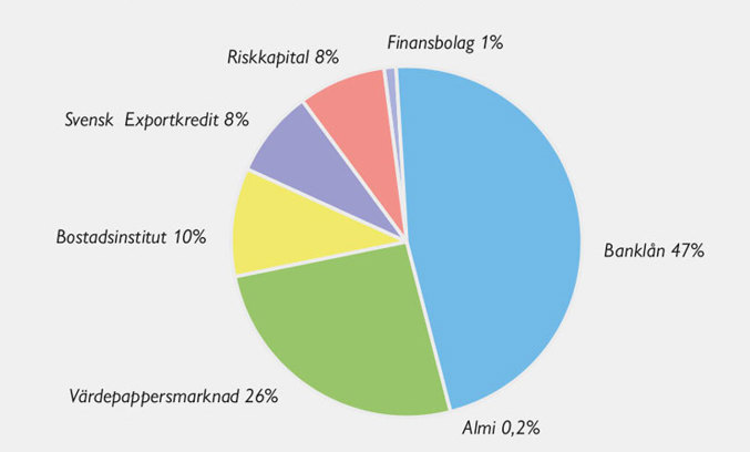 Av företagens totala externa finansiering kommer omkring hälften från banklån, en fjärdedel från värdepappersmarknaden och den sista fjärdedelen från en mix av riskkapital, statliga stöd och bostadsinstitut.
