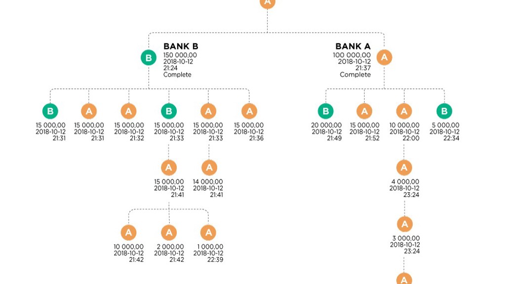 Från målvaktens konto skickas pengarna vidare till många andra målvakters konto, och delas på så sätt upp i mindre summor. De andra målvakternas konton finns på flera olika banker.