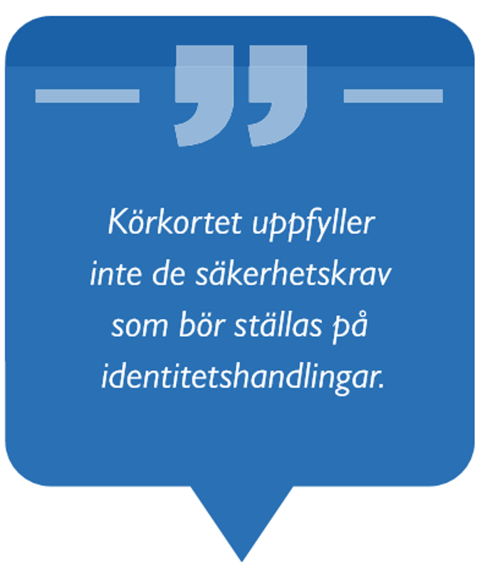 Utredningen föreslår också att körkortet inte kommer att vara en statlig identitetshandling. Anledningen till det är att körkortet inte uppfyller de säkerhetskrav som bör ställas på identitetshandlingar. Utredningens förslag föreslås träda i kraft den 1 januari 2022.