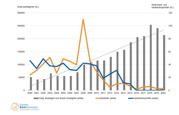 Samhällets digitalisering har förändrat den ekonomiska brottsligheten. När pengarna flyttade från den fysiska världen till den digitala, flyttade de kriminella med. Medan bank- och värdetransportrån är nere på ett fåtal årligen, har antalet bedrägerier fördubblats på tio år. Att höja konsumenters digitala säkerhetsmedvetande och stärka identifieringsprocessen är prioriterade frågor för Bankföreningen och bankerna.