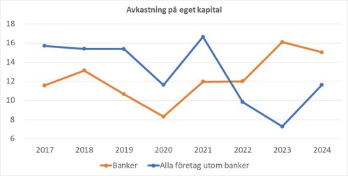 I diagrammet nedan visas avkastningen på eget kapital i bankerna och avkastningen på eget kapital i övriga stora börsföretag under perioden 2017 till 2024. Det framgår av diagrammet att banker inte har högre avkastning än andra företag sett över tid, tvärtom ligger bankernas lönsamhet lägre än andra företag de flesta år.