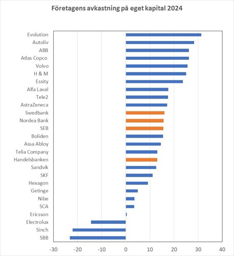 De fyra största bankernas lönsamhet, mätt som avkastning på eget kapital, var 2024 något högre än snittet för de största företagen på Stockholmsbörsen. Bankerna minskade avkastningen på eget kapital jämfört med föregående år, samtidigt som andra företag hade bättre avkastning på eget kapital än tidigare år. Den övergripande bilden av att bankerna inte gör övervinster kvarstår dock.